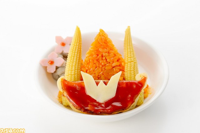 『戦国無双4-II』より新参戦した井伊直政の迫力ある兜を、大粒の餃子とチキンライスで真っ赤に再現しました。戦前にピッタリのボリューム満点餃子で腹ごしらえだ! おや、直政を心配して、井伊直虎が後ろに…。