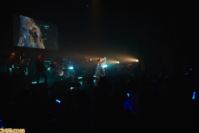 いよいよ開幕。ライブは、歴代『ブレイブルー』シリーズ4作(『カラミティ・トリガー』、『コンティニュアムシフト』、『クロノファンタズマ』、『クロノファンタズマVer2.0』)のテーマ曲から! 6人のバンド編成(ギター×2、ベース、ドラム、キーボード、バイオリン)によって激しいサウンドが奏でられると同時に、ステージ背景のスクリーンからは各シリーズのムービーが流れるという粋な始まりとなった。アリーナからは“蒼”をキーワードにした本シリーズらしく青色のサイリウムが美しく輝く。対戦格闘ゲームさながらの疾走感とカッコよさに満ちたサウンドに、すべての観客のテンションはいきなりマックスに到達した盛り上がりをみせた。
