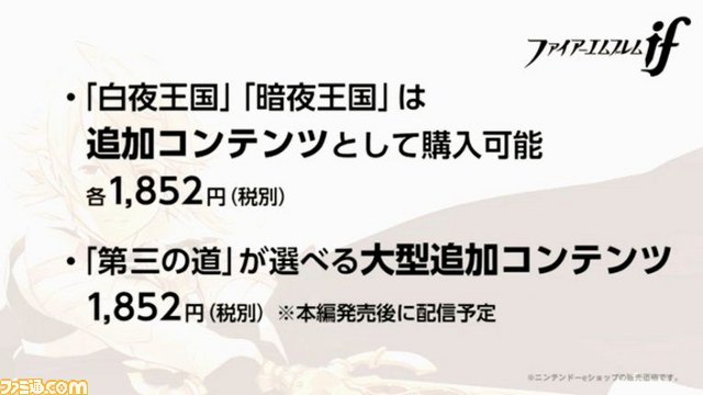 『ファイアーエムブレムif』は『白夜王国』『暗夜王国』ともに2015年6月25日発売予定で、価格はそれぞれ4700円(税別)。ただし、片方を購入すると、もう片方は追加コンテンツとして1852円(税別)で購入可能。またダウンロード版(4700円、税別)では、冒頭部分を遊んでからどちらのシナリオにするかを選ぶことができる。