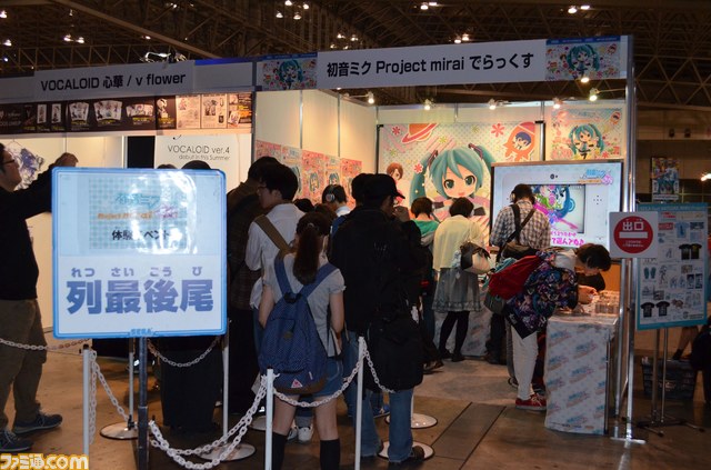 2015年4月25日、26日に、千葉県の幕張メッセで開催されている“ニコニコ超会議2015”。HALL7の超ボーカロイドエリアには、セガゲームスのニンテンドー3DS用ソフト『初音ミク Project mirai でらっくす』(2015年5月28日発売予定)の体験ブースが出展されています。