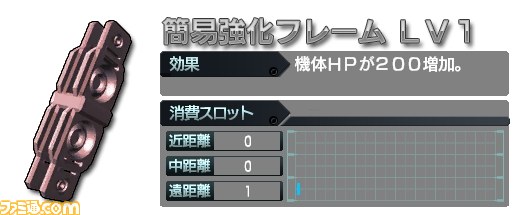 4月27日(月)14:00 より開始される週間任務では、効果が低いかわりに消費スロット数が抑えられた「簡易カスタムパーツ」シリーズの一つとして、「簡易強化フレーム」のLV1設計図が入手できます。