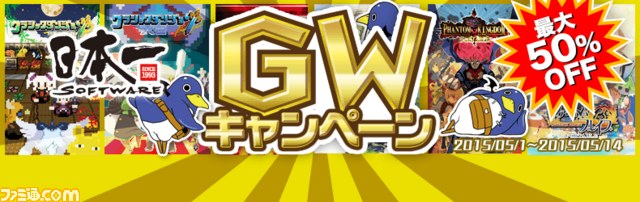 日本一ソフトウェアは、2015年5月1日(金)~5月14日(木)の期間中、PlayStation Storeにて『日本一ソフトウェア GWキャンペーン』を開催いたします。期間中は配信中の下記ダウンロードタイトルをお求めやすいキャンペーン価格でご提供! いずれもゴールデンウィークに最適なやり込み度満点の人気タイトルです。未プレイの方はぜひこの機会に遊んでみてくださいね!
