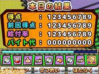 バイトでの結果集計画面です。基本得点に加算減算が入り、バイト代が決まります。また、バイトで成功した分、経験値が入り、レベルアップや技の習得、レベルダウンなどもこの画面で発表されます。