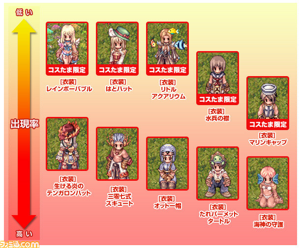さわやかな波が閉じ込められたようなたまごに入っているのは、夏のトレンドをおさえた衣装装備が全部で10種。限定衣装装備には「アイテムデザインコンテスト2014」の銅賞作品である「[衣装] はとハット」と「[衣装] リトルアクアリウム」、オリジナルデザインは「[衣装] 水兵の襟」、「[衣装] マリンキャップ」そして「[衣装] レインボーバブル」と、ひとつだけでも身につければ一気に夏色に染まれる衣装装備となっています。