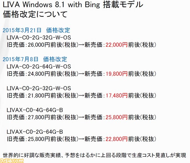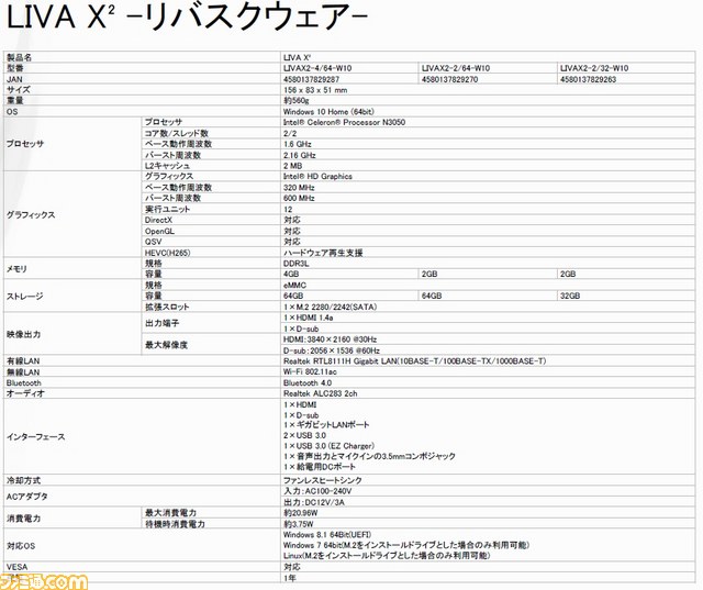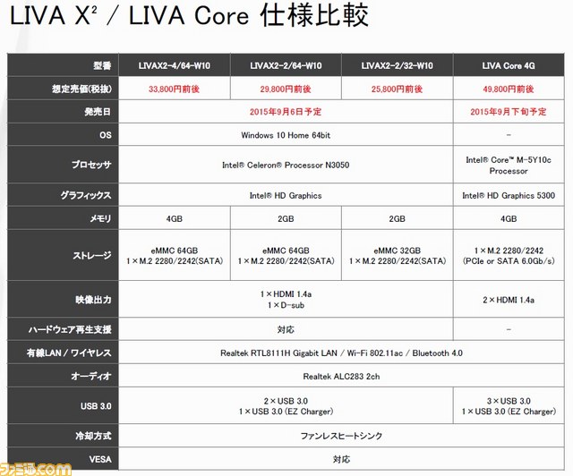 1機種目は、は9月6日に発売予定“LIVA X2(リヴァ スクウェア)”。Windows 10の発表を待って発表した製品ということもあって、LIVA製品では初となるWindows 10の搭載モデルとなる。特徴としては小型ながら4k出力に対応し、「価格を抑えたコストパフォーマンスに優れたPC」と述べた。ストレージとメモリーの容量が異なるラインアップを3モデル発売する予定で、最上位モデルは33800円前後での販売を予定している。