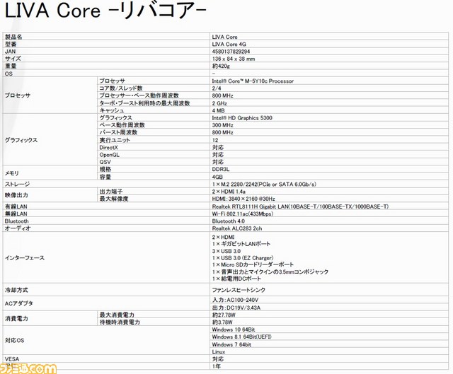 2機種目は9月下旬発売予定の“LIVA Core(リヴァ コア)”。インテル Core Mプロセッサーを搭載したハイスペック小型PCとなる。インテル Core Mプロセッサーは、従来の省電力性の高いCPUと比べても、より省電力で動作するように設計された製品となる。省電力CPUながら、高性能な内蔵グラフィックス機能を備えており、グラフィックボード搭載PCとまではいかないものの、カジュアルなオンラインゲームなら難なく動作するだろう。また、HDMIを2系等備えているので、マルチディスプレイにも対応している。なお、LIVA Coreのラインアップは1モデルのみで49800円前後で販売予定。別途OSとM.2またはmSATAのストレージを用意する必要がある点に注意して欲しい。