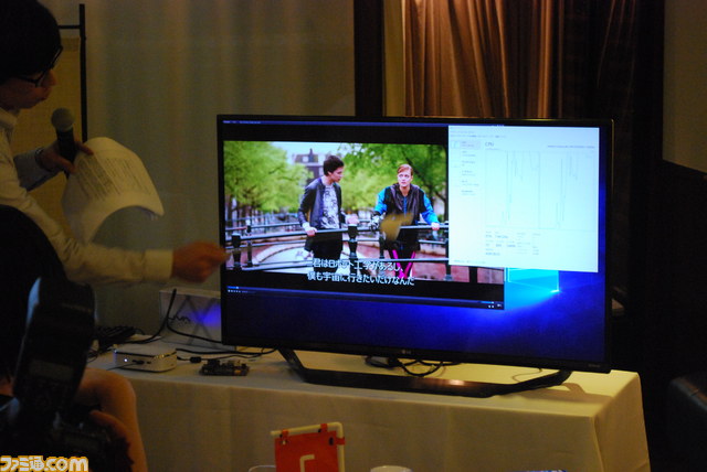 つぎにリンクスインターナショナル広報担当の阪口貴紀氏が新製品の詳しい説明と、LIVA X2のデモンストレーションを行った。LIVA X2は、HEVC(H.265)のハードウェア再生支援機能に対応しており、対応した動画ならCPUの使用率を抑えながら動画を滑らかに再生できる。最近ではニコニコ動画などがHEVCに対応している。