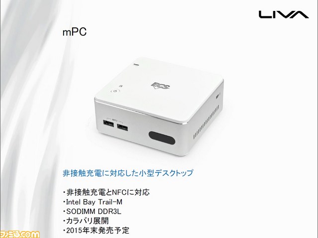 最後に2015年末発売のスマートフォンなどを載せるだけで充電できる非接触充電に対応した小型PC“mPC”の紹介と組み込み型のLIVAを使った製品が紹介された。歌詞に合わせて歌詞とグラフィカルの映像を生成する無線スピーカーと、設置が簡単で費用を抑えられ、複数の監視カメラを遠隔操作や制御ができる製品の説明が行われた。