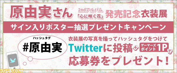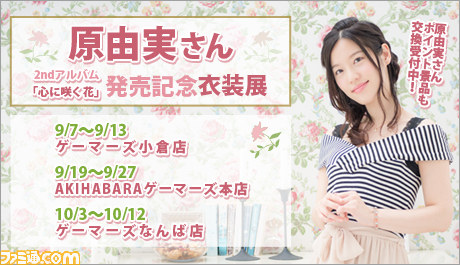声優・歌手として活躍する原由実さんの2ndアルバム“心に咲く花”が、2015年9月25日に発売予定。その発売を記念しての衣装展が、ゲーマーズ3店舗で公開される。開催店舗は以下の通り。