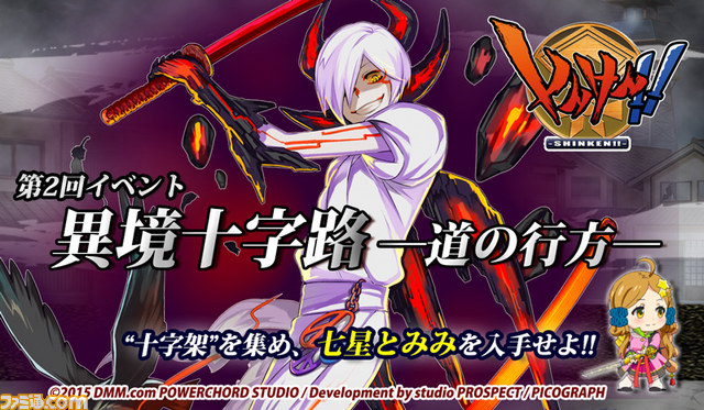 DMMオンラインゲームにてサービス中のPC向けブラウザゲーム『しんけん!!』において、ゲーム内イベント“異境十字路 -道の行方-”が本日2015年9月1日のメンテナンス終了後より開催される。イベントでは、新たな“妖刀鬼女”に加え、直刀“七星とみみ”も登場する。