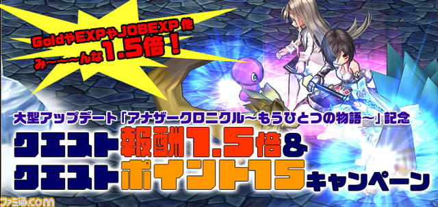 また、本日9月10日(木)定期メンテナンス終了より、大型アップデート「アナザークロニクル~もうひとつの物語~」に備えていただくべく、 クエストをクリアした時の報酬(Gold、EXP、JOBEXP、パートナーが獲得するEXP、EP、CP、マテリアルポイント、セクトポイント)が1.5倍に大幅アップする「クエスト報酬1.5倍キャンペーン」を開催!