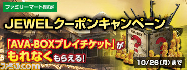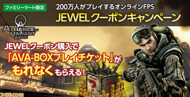 株式会社ゲームオン[本社:東京都渋谷区、代表取締役社長:李 相燁(イ サンヨプ)、以下ゲームオン]は、株式会社ファミリーマート [本社:東京都豊島区/代表取締役社長:中山勇] 、株式会社ファミマ・ドット・コム[本社:東京都豊島区/代表取締役社長:竹林昇]と協力し、200万人がプレイする日本No.1オンラインFPS『Alliance of Valiant Arms』(アライアンス オブ ヴァリアント アームズ、以下『AVA』)において、本日2015年10月6日(火)から10月26日(月)まで、「【ファミリーマート限定】JEWELクーポンキャンペーン」を実施いたします。