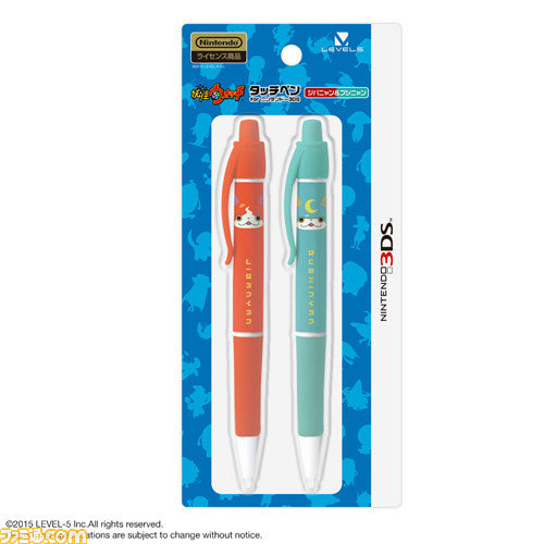 「妖怪ウォッチ タッチペン for ニンテンドー3DS」は全てのニンテンドー3DSシリーズに対応しており、使わない時はペン先を収納できるノック式です。“ジバニャン&ブシニャン”をあしらったデザインを組み合わせて2本1セットとなっています。