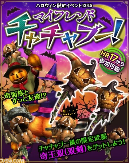 今年のハロウィンはいつもと違う!? 限定武器「奇王双」(双剣)や、歴代のハロウィンイベント武具の生産素材を入手できます。ちょっと不思議な依頼主からのお願いを叶えて、季節感たっぷりの限定武具をゲットしよう!