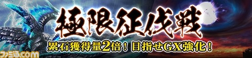 今回の極限征伐戦は、Lv.200までにノルマ突破報酬で獲得できる「絢累石」と「輝累石」の量が2倍! そして、所持することで極征レベルが通常よりもアップするアイテム「極征推薦状【紫】」が手に入るG級デイリークエストも同時配信! この1週間は、G級防具を一気に強化するチャンス!!