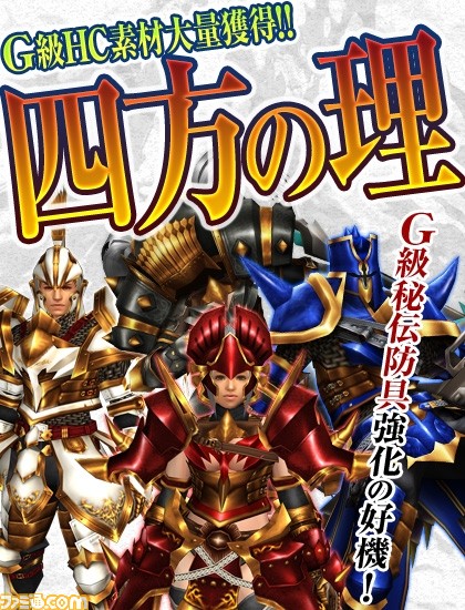 「G級秘伝防具」や「G級覇種武具」、「烈種武具」などの強化に必要な「G級HC素材」をクエスト報酬で入手することができるクエストを集めた「四方の理」シリーズを配信いたします。期間中、毎日3本のクエストを日替わりで配信!