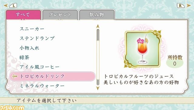 部屋デートに来た守護聖を収穫祭で買った飲み物でおもてなしすることができます。部屋デートでは1度に1つの話しかできませんが、好きな飲み物でおもてなしすると、守護聖の話をもう1つ聞くことができます。相手のことをよく知りたいときには、おもてなし作戦が有効です。