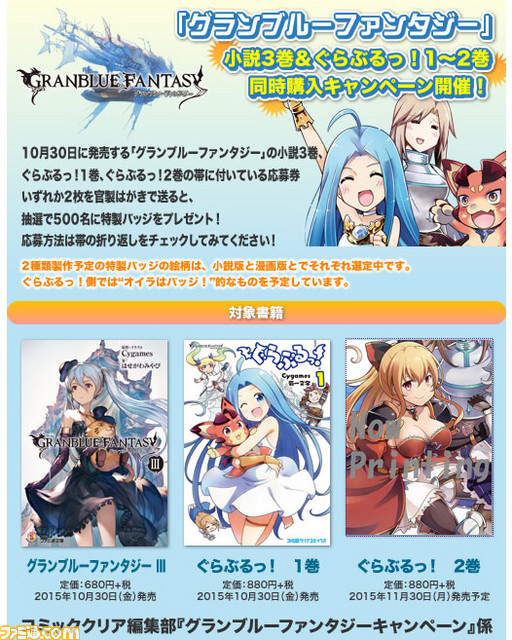 KADOKAWAは、スマートフォンで配信中の王道ファンタジーゲーム『グランブルーファンタジー』について、公式ノベライズ『グランブルーファンタジー III』と、公式4コママンガ『ぐらぶるっ!』を2015年10月30日に同時発売する。それぞれの書籍にはゲーム内で使えるアイテムコード付がついてくる。さらに抽選でオリジナル缶バッジが当たる合同キャンペーンも開催。