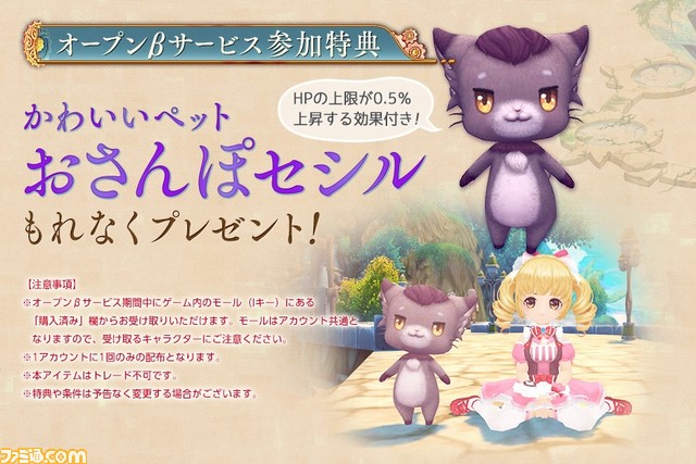 秘密基地の中でプレイヤーの手伝いをしてくれるかわいいNPC「セシル」を、ペットとして一緒に冒険に連れ出せるアイテム「おさんぽセシル」をもれなく全員にプレゼントいたします。おさんぽセシルは、連れて歩くとHPの上限が0.5%上昇する特別な効果が付いています。