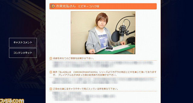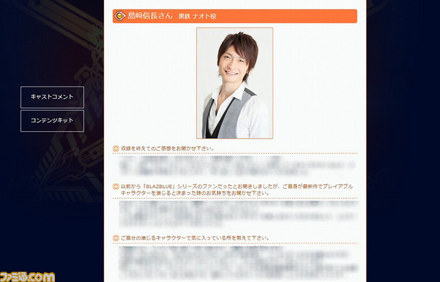 「収録後の感想」「キャラクターの気に入っている所」など、新キャラクターに込められたお二人の想いを感じる事が出来る、BLAZBLUE ファン垂涎のキャストコメントですので、くれぐれもお見逃しなきようご注意下さい。