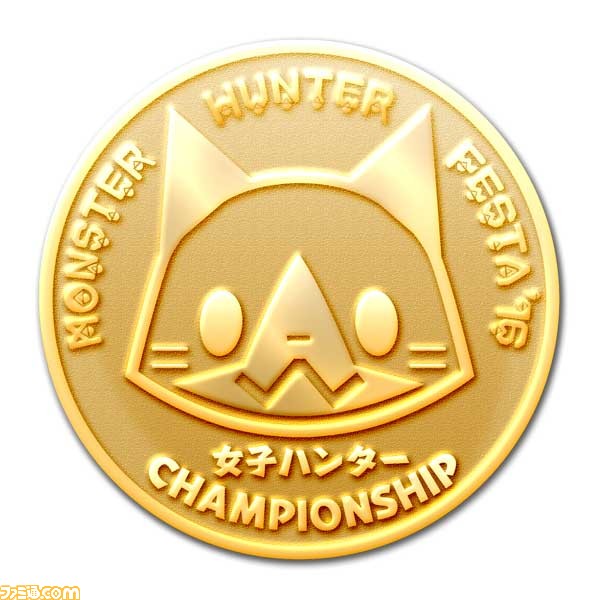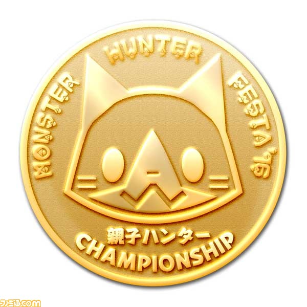 狩王決定戦の優勝者に与えられるのは、この「4大メインモンスターヘッドレリーフ」。『モンスターハンタークロス』を象徴する4頭のメインモンスターをデザインしたオリジナルの楯! 親子・女子ハンター日本一決定戦の優勝賞品は、かわいいアイルー柄が入ったメダルだ!