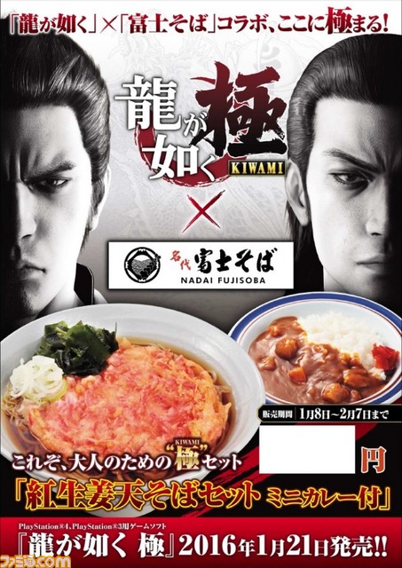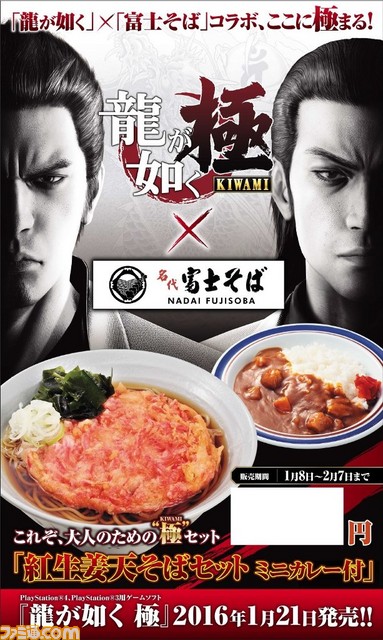 セガゲームスは、2016年1月21日発売予定のプレイステーション4、プレイステーション3用ソフト『龍が如く 極』について、東京都内を中心に展開する立ち食いそばチェーン“名代 富士そば”とのコラボを本日1月8日より開始した。