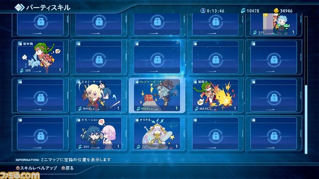 パーティスキルは、採取系やドロップ系など、効果によって数種類に大別できる。ここでは、たくさん用意されているパーティスキルの一部を公開。各スキルのアイコンにもなっている、メイン採取系パーティスキル キャラクターたちのかわいいイラストにも注目!