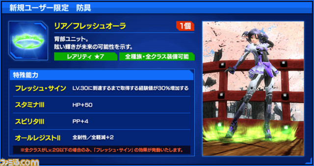 (3)、防具「リア/フレッシュオーラ」(LV.30 到達まで取得する経験値が30%増加するなどの効果を持つ)×1個