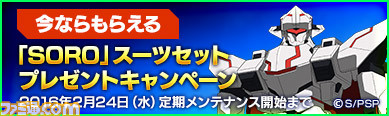 キャンペーン内容:EPISODE4 のストーリーを進めるためのデバイス「ストーリーボード」の対象ピースをクリアしているキャラクターがいる方に、TV アニメでおなじみの「SORO」スーツセット(SORO・レプカM、SORO・レプカF、SOROマント)を今ならプレゼント!