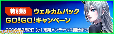 キャンペーン内容:2015年12月22日(火)定期メンテナンス終了以降にゲームにログインしていなかったアカウントでキャンペーン期間中にログインした方に、豪華アイテム11種、合計255個をプレゼント! さらに、キャンペーン対象者がゲーム内チャット(チームチャット)で「ただいま」と発言すると所属するチームメンバーにもトライブースト+100%をプレゼント!
