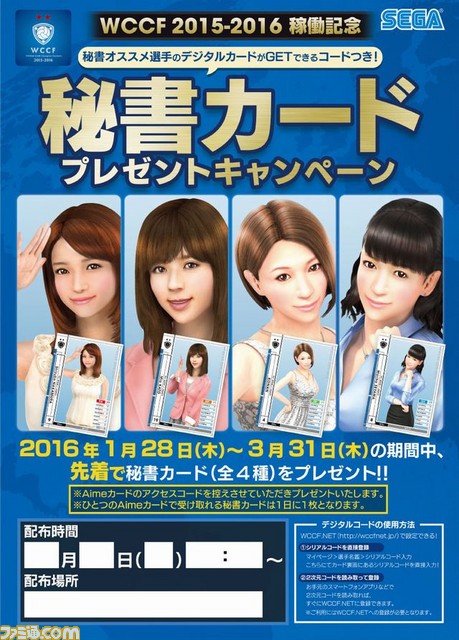 株式会社セガ・インタラクティブは、WCCF 2015-2016の稼働を記念して、全国のWCCF 2015-2016設置しているアミューズメント施設にて「秘書カードプレゼントキャンペーン」を実施いたします。