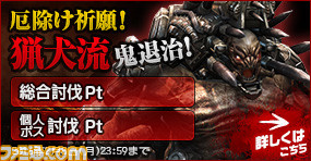 二つ目は大鬼(ボスモンスター)が出現するミッションのクリアに応じてポイントをカウントし、達成条件に応じて個人報酬をプレゼントするイベントです。