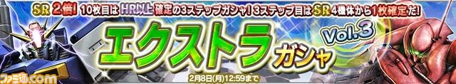 当時の目玉機体である「SR 高機動型ザクII(ライデン専用)」、「SR デュエルガンダム」、「SR ジョニー・ライデン」、 「SR イザーク・ジュール」などのSRカードが出現する復刻版ガシャです。 特典として、SRの出現率が3倍になっており、さらに、3連ガシャは3枚目がHR以上確定になっています。