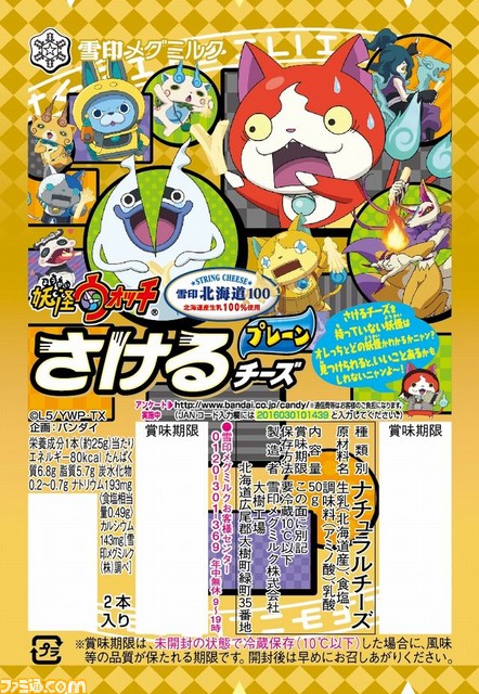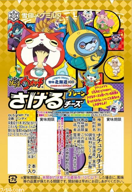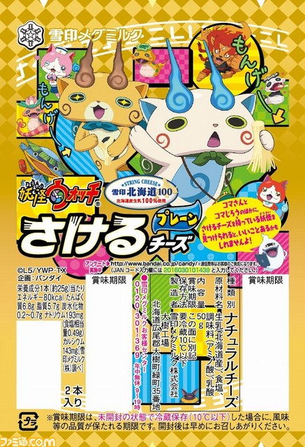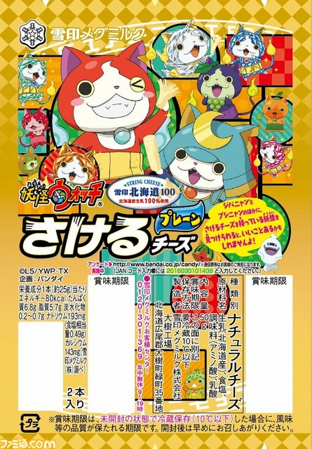 バンダイと雪印メグミルクとの共同企画で、全4柄の“雪印北海道100 妖怪ウォッチ さけるチーズ プレーン”が、2016年3月1日より、全国の量販店、コンビニエンスストアなどにて発売されることが決定した。価格は210円[税抜]。