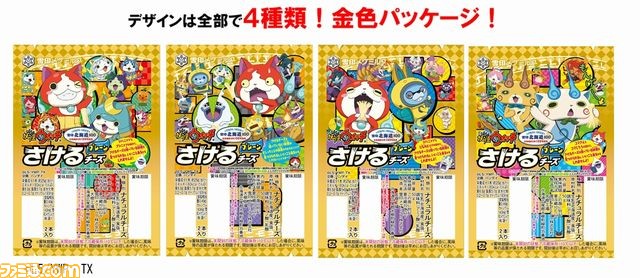プレミアム感のある金色のパッケージには、新規描き下ろし(一部を除く)の“さけるチーズを持った妖怪たち”のイラストが描かれており、全4柄で展開します。メインターゲットは、「妖怪ウォッチ」が好きなファミリー世帯です。