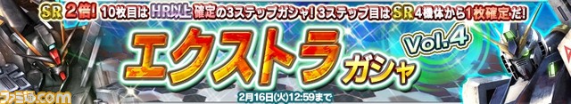 SR2倍! 10枚目はHR以上確定の期間限定ガシャ! 1日1回限り! 3ステップ目はなんとSR4機体から1枚確定! 各ステップ10連の3段階ステップアップガシャになっており、各ステップ1日1回限り引くことができます。SR出現率が2倍になっており、1~2ステップ目は、10枚目がHR以上確定で3ステップ目は、「SR νガンダム」「SR サザビー」「SR ストライクノワール」「SR プロヴィデンスガンダム」の中から1枚確定になっています! 更におまけとして「SR ハロ(勢力なし)×1枚」、「SR 強化カプセル(勢力なし)×1枚」「レアバッジ×5個」、「合成強化ガシャメダル×5枚」もついてきます!