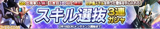 1日5回限定! SR率3倍の3連ガシャ、3枚目HR以上確定! 高評価スキルを所持した機体、キャラクターをラインナップしたスペシャルガシャ登場! 人気のスキルを所持している機体/パイロット/サポートをを中心にラインナップしたガシャです。本ガシャは、1日5回まで引くことができ、SR出現率が、3倍になっています。さらに、3枚目はHR以上確定になっており、おまけとして『ライブメダル×15枚』が付いてきます。