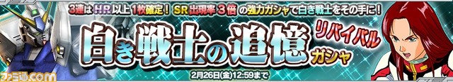 リバイバルガシャ第3弾! 今回は「SR アレックス」と「SR アストレイブルーフレーム フル・ウェポン」が再登場! 3連ガシャはHR以上1枚確定! 当時の目玉機体である「SR アレックス」、「SR アストレイブルーフレーム フル・ウェポン」「SR クリスチーナ・マッケンジー」、「SR 叢雲 劾」などのSRカードが出現する復刻版ガシャです。特典として、SRの出現率が3倍になっており、さらに、3連ガシャは3枚目がHR以上確定になっています。