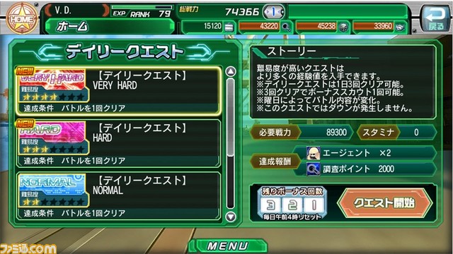 毎日3回までチャレンジ可能の“デイリークエスト”。入手経験値が多く、総戦力の向上にもぴったりのクエストが、キャンペーン期間中入手経験値が2倍にアップ致します。