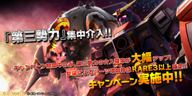 キャンペーン期間中のみ、第三勢力『アプサラスII』と『サイコ・ガンダム』の介入確率が大幅にアップします。第三勢力を撃破すると戦闘報酬のパーツ枠が+1! 更にこのキャンペーン中に第三勢力を撃破すると、「第三勢力撃破によるパーツ増加枠」がRARE3以上確定!!