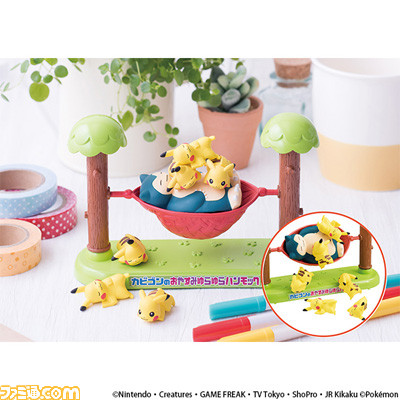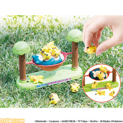 ポケモンのおもちゃも豪華プレゼント! ハンモックの上でおひるねしているカビゴンの上に、気づかれないように順番にピカチュウをそ~っとのせていく、バランスゲームです。失敗すると、ハンモックがゆれてピカチュウが落ちてしまうよ。この状態になった人の負け。ピカチュウ6匹をカビゴンのおなかの上で気持ちよくおひるねさせてあげよう♪ デスクの上に飾ってもかわいい、卓上サイズ☆