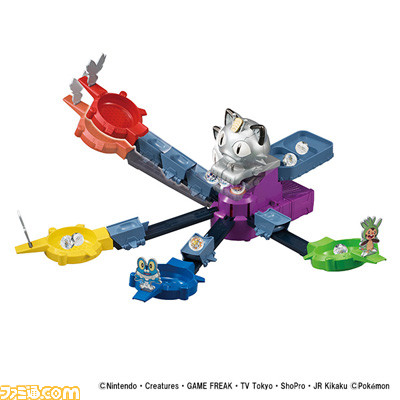 ポケモンのおもちゃも豪華プレゼント! だれも見たことのないロケット団の新兵器「ニャース基地」始動!トロッコをタイミングよくニャース基地に突撃させて、モンスターボールに入ったポケモンを助け出そう! 誰が、いちばんたくさんのポケモンを助けられるかな?