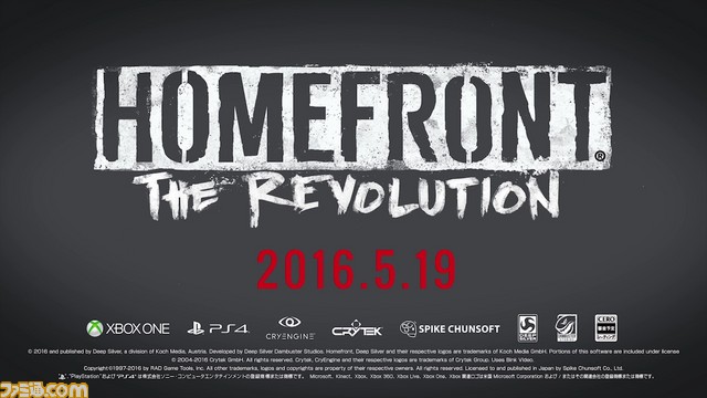 (C) 2016 and published by Deep Silver, a division of Koch Media, Austria. Developed by Deep Silver DambusterStudios. Homefront, Deep Silver and their respective logos are trademarks of Koch Media GmbH. Portions of this software are included under license (C) 2004-2016 CrytekGmbH. All rights reserved. Crytek, CryEngineand their respective logos are trademarks of CrytekGroup. Uses BinkVideo. Copyright (C)1997-2016 by RAD Game Tools, Inc. All other trademarks, logos and copyrights are property of their respective owners. All rights reserved. Licensed to and published in Japan by Spike ChunsoftCo., Ltd.