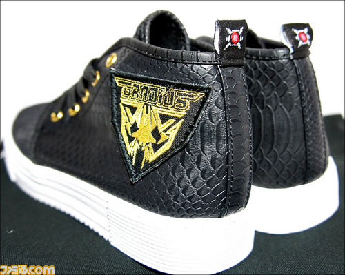「グラディウス スニーカー Game Master 80」は主役機・グラディウス宇宙空軍に属する超時空戦闘機「Vic Viper」の「バイパー」(毒蛇)に因んで、合成皮革型押し加工で蛇柄が施されたエンボスレザーをメイン素材として使用し、その上に、極細の金属糸(ゴールド刺繍)を用いたグラディウスのロゴとビックバイパーのシルエットでデザインされたオリジナル刺繍エンブレムを配置!