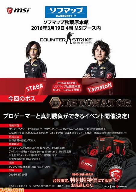 ソフマップは、プロゲーミングチーム“DeToNator”所属のSTABA選手とYamatoN選手と『CS:GO(カウンターストライクグローバルオフェンシブ)』の対戦ができるイベントを、2016年3月19日に東京・ソフマップ秋葉原本館にて開催することを明らかにした。