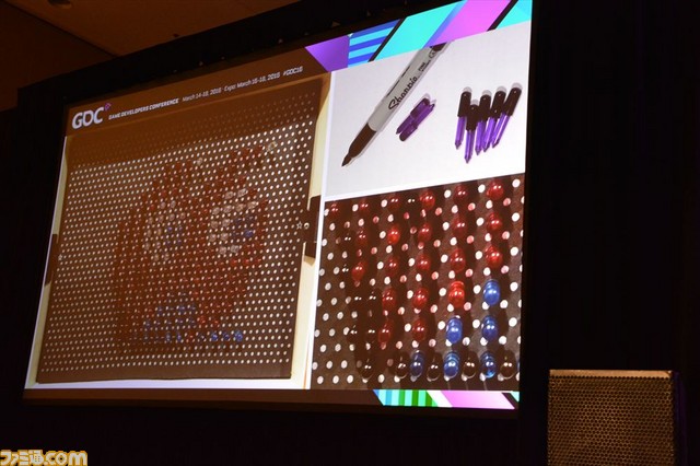 ちなみにキャラクターのデザインに関しては、当初は方眼紙に書いて、それをコード化、実機にて確認というプロセスが必要だったので、とにかく時間がかかった。それで、“Lite Brite”という発光ダイオードのおもちゃでキャラクターを作って試したのだという。