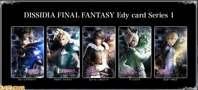 『DISSIDIA FINAL FANTASY』Edyカードのシリーズ1では、ウォーリア オブ ライト、クラウド・ストライフ、スコール・レオンハート、ヤ・シュトラ、ラムザ・べオルブをラインナップしており、順次キャラクターを追加していく予定です。