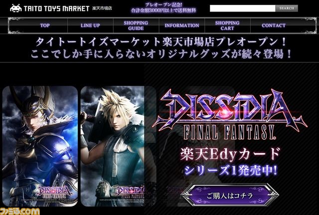 TAITO Toys Marketは、キャラクターの魅力を活かしたオリジナルな商品を取り扱うECサイトで、第1弾として販売するのは、『DISSIDIA FINAL FANTASY』(ディシディア ファイナルファンタジー)に登場する歴代のキャラクターがデザインされた楽天Edyカードで、本ECサイト限定での発売となります。