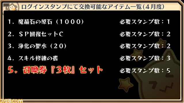 毎日初回ログイン時にスタンプが捺されます。それを貯めることにより、「スタンプ商店」にてポイント召喚券など、冒険に役立つ様々なアイテムとの交換が可能となります。4月は累計5日間のスタンプを貯めることにより、「ポイント召喚券」3枚と交換可能となっております。