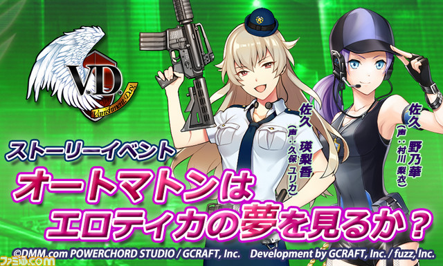 DMM.com POWERCHORD STUDIOは、2016年4月26日(金)のメンテナンス終了後より、タクティカルバトルRPG『V.D.-Vanishment Day-(バニッシュメント・デイ)』(以下V.D.)におきまして、ストーリーイベント『オートマトンはエロティカの夢を見るか?』を開催致します。C.M.S.基地内で盗難事件発生! 新キャラクターであるSRヘビーガンナー「佐久 瑛梨香(CV.久保 ユリカ)」、SRスナイパー「佐久 野乃華(CV.村川 梨衣)」も加わり繰り広げられる事件の真相とは?! イベント後半には、入手戦績を大幅アップできる時間限定クエストも出現。特効武器と合わせて戦績を一気にゲットし、豪華報酬を手に入れましょう!